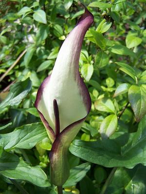 BULBSArum euxinum - This Arum is variable. The incarnation as in the offsets we are offering is solid pale, luminous green - sort of the color of the cool white-touched-with-green rind of winter melon just behind the outer peel: the effect is rather like the reflector behind the electric bulb in a lighthouse. A beautiful rich picotee violet-purple edge limns the margins of the spathe. A light tan spadix juts up cloaked by the spathe. Some individuals of this fascinating arum are spotted purple in spring sporting an open, blade-shaped and concave spathe from which the pale tan spadix juts up. Some individuals display a purple wash throughout the hood's interior becoming pale green to greenish white towards the base where the one side of the hood gently wraps over the other. We find all the aroids fascinating, primitive, oddly alluring, curious, with some - those emitting stink exuding implied malevolence. They are amazing. In flower their exotic texture is unequaled in the garden adding distinctive interest. The leaves aren't bad either: relatively narrow, elongated arrowheads in deep satiny green. From the Black Sea Coast region of Northern Turkey this somewhat rare aroid will revel in light to dappled shade in moist ground. In Turkey it is often found in marshy areas. And it may be a better doer a bit farther north than many of its cousins. Many sources indicate USDA zone 5 hardiness. We have placed cautionary parentheses around the 5 implying a more conservative posture. Established pot grown bulb.