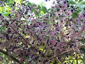 DECIDUOUS SHRUBSAralia spinosa – Devil's Walking Stick is fascinating but not for the faint of heart! Coarse stalks armed with multitudes of sharp, raspy spines may grow to a staggering 20 feet though often top-off lower with foliage tufted at varying lenghts in a circle around stems with the final group set terminally. Leaves are ferny, pinnate compound and add a tropical air to this very hardy plant. Flowers are an amazing array of exploding fireworks in huge, branched structures that may stretch to 18 inches like a star cloud. Each constellation of florets, each little solar system tends to be pinkish-white and draw an amazing array of pollinators. One approaching a stand can hear the white noise (or maybe pink noise) from many feet away. These give way to small, round green "berries" which eventually turn purple-black as peduncles turn pink. Also called Hercules Club (I never thought Hercules was evil?) this is a woody plant that will quickly colonize an area becoming an impenetrable stand; therefore, careful consideration must be given when siting Aralia spinosa. Dirr states Devil's Walking Stick may want to continue gaining ground to "infinity". Native populations occur from Maine diagonally to Texas and east to Florida, north to Massachusetts encompassing parts of all these states except, apparently, Vermont and New Hampshire. Fertile soil in full sun to dappled and open shade. Established pot grown plant.