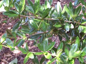 Berberis pruinosa ​Leathery evergreen leaves with spiny serrations in tufts of 5 occur on this handsome shrub. Sunny yellow flowers are followed by oval blackish fruits with a white powdery bloom give a light blue look to each fruit. Hollyleaf Barberry is an upright shrub formed of arching thorny canes. Armed stems are on the vicious end of the weaponed meter. Nevertheless it is a very attractive shrub. It is virtually evergreen for us. Site Berberis pruinosa in fertile soil planted in full to part sun. Cutting grown.