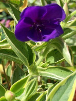 DECIDUOUS SHRUBSTibouchina urvilleana 'Variegata' - This, the variegated form of Princess Flower, Glory Bush or Purple Glory Bush is just plain beautiful! My first experience with this plant were 6- to 7-foot tall espaliered specimens against brick walls which enclose one of the marvelous gardens on the historic Old Westbury estate on Long Island, NY. The striking green cordate leaves, handsomely veined, are all evenly covered in short silver hairs. The large, open-faced royal purple flowers stud the stems for much of the summer. And this cultivar, 'Variegata', offers the added bonus of golden margins. Wow! No wonder it has so many common names: with that kind of popularity we'd have lots of common names, too... okay, okay, maybe not such a good thing. Site in full sun in fertile, draining soil where it can be grown outdoors. It will make a gorgeous potted plant in the north in a greenhouse or sun-basked conservatory. Either way Tibouchina urvilleana 'Variegata' will make a spectacular specimen. In the north when freezing nights have passed and our growing season has waxed towards late spring bring it outdoors and set it on a patio or near the front steps where it will be seen often. Prune it to keep it smaller and bushier... or not! And speaking of pruning these may be topped-off to slow their tendency to grow too tall very quickly in a container. This will make them branch, thicken and broaden. For gardeners towards the northern end of its range spring planting is strongly advised. Cutting grown.