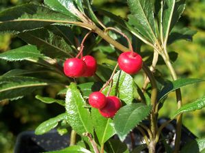 BROADLEAF EVERGREEN SHRUBSArdisia japonica 'Chirimen' (ex: Jonathan Lehrer) - Starry pink to white spring flowers give way to very showy, fat, bright red, persistent, glossy berries (too many adjectives??) which last into the following spring. Dark green glossy leaves look as if they were made of vinyl display serrated, almost spiny looking edges. As weather cools in autumn the evergreen leaves pick up a bronze tone. This is the hardiest form of Marlberry, this handsome selection having been made at J.C. Raulston Arboretum. Once it settles in 'Chirimen' will make a lush, suckering ground cover in fertile, moisture retaining acid soil in part sun to open shade. Established pot grown plant.