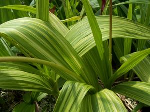 BULBSBletilla striata 'Gotemba Stripes' - Stunning pleated leaves are richly and longitudinally striped green and gold. The golden color fades to creamy white as the leaves age. It's a show stopper in part sun. Typical June deep purple flowers on the red side of the spectrum are beautiful. Plant ‘Gotemba Stripes’ in fertile, enriched moisture-retaining soil sited in part sun conditions. Clumping with moderate increase. Once established Bletilla demonstrates some drought tolerance. Established potted orchid by division.