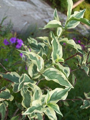 DECIDUOUS SHRUBSCornus mas 'Variegata' - The variegated form of Cornelian Cherry is one of the least available, vastly unappreciated shrubs in the available inventory of woody garden candidates in the U.S. It is just plain beautiful with each leaf broadly margined in creamy white and often decent autumn color in red-purple follows. The bark becomes increasingly mottled and flaked - more and more beautiful with each passing season for great looks even when defoliated. Cornelian Cherry will be a terrific four-season interest large shrub if allowed or may be pruned to a small tree if controlled. Oh! And don't forget about the cloud of warm yellow the entire shrub metamorphoses into in the early spring. Late season red fruits stud the variegated leaves and put on quite a show. The variegated form of this plant would make a head turning specimen. Full to mostly sunny siting planted in fertile, draining soil. Cutting grown.