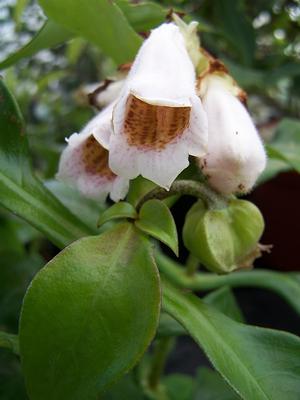 SHADE PERENNIALSHemiboea subcapitata - White tubular late spring/summer flowers in abundance on this very hardy Gesneriad, the Glossy False Sinningia. The inner throats of the delicate tubular flowers are honey colored with darker spotting... looks like a good hummingbird candidate. Glossy dark green leaves are bold, quite handsome and of very thick texture. A single leaf on a happy plant may grow as long as 12 inches. The foliage would certainly contrast well to any compound pinnate ferns - I'm thinking Japanese Painted Fern would be especially beautiful. Considering the size of a growing colony a larger growing fern in the background would also be picturesque. In any application Hemiboea subcapitata is a choice perennial. Site in open shade in fertile, organic evenly moist soil. Division or cutting grown.