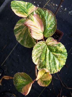 DECIDUOUS SHRUBSViburnum furcatum "white variegated" - This, the irregularly cream-white variegated form of the Scarlet-leaved Viburnum is genuinely rare. White spring lace cap flowers are beautiful. Its bold foliage is a knockout. And the late season Autumn leaf color can be fluorescent pink and red-purple. Amazing. Green reversions do occur on stems and then surprise! the variegation shows up again. One can always prune out the solid green stems though it may make for an interesting form or to wax positive: one with great character. Man, I'm gettin' myself in deep here! Bold leaves, great fall color, bright red berries, pretty flowers - this is an all-round strikingly gorgeous shrub. The best way to assure more plants is by grafting or cuttings as not all seed comes "true". And those which come "true" display the variegated character to a greater or lesser degree but they are mostly all green. Site in morning sun to three-quarters open shade in fertile soil. V. furcatum thrives in situations protected from hot, intense afternoon sun - it is crucial to keep the "white variegated" form out of scorching rays of harsh afternoon sun. There is some tendency towards reversion and these should be carefully pruned out. Ours are cutting grown from the most variegated portions of the plant the lend themselves to the procedure.