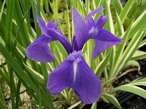 SUN PERENNIALSIris laevigata 'Variegata' - The variegated Rabbit-ear Iris shows off beautiful blue-purple iris flowers, with 3 casually pendent falls, each sporting a showy silver-white signal, gracing the smaller standards. Spring flowering, it may bloom into early summer in the north. Extending its interest beyond the flowering even are the gorgeous fans of flattened blades, dark green with generous, broad white stripe in each leaf. Yet another great feature is that Iris laevigata 'Variegata' is virtually evergreen in its more southern haunts. This species seems to be lesser known yet its beauty demands more attention. Site in full sun planted in moist to wet fertile soil - nice at the edge of a pond. Lime-tolerant. Division.