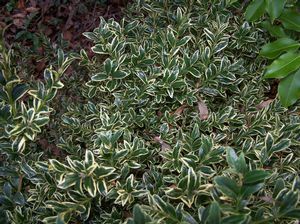 Buxus sempervirens ‘Aureo-variegata’ (ex: Nickou) – is a larger growing mounding boxwood, a real beauty with strong cream variegations at leaf margins. It's gorgeous! Plant only larger established plants at the northern end of the zone range and in the spring for better establishment. English Boxwood is best sited protected from prevailing winter winds. Fertile draining soil on the neutral to acid side of the Ph spectrum in part sun, afternoon shade. Organic mulches are very beneficial. The origins of this form are unknown… but the species originates in So. Europe, W. Asia, No. Africa. Cutting grown.