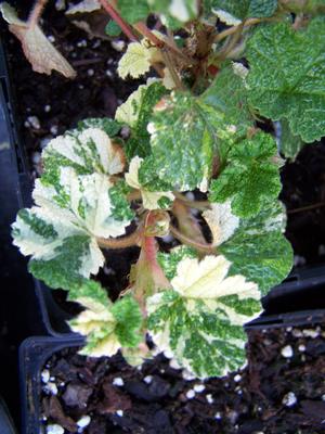 BROADLEAF EVERGREEN SHRUBSRubus pentalobus (syn. calycinoides) 'Sonya's Parasol' - Creamy white splotches and streaks occur on all green leaves with no two exactly alike. All coarse leaves are shallowly and gently lobed and densely set along hairy, overlapping stems forming a solid ground cover. New stems display a pinkish tint. White flowers form upright light orange raspberry fruits that are delicately sweet. Autumn brings burgundy to bronze coloring and in more mild climates remains evergreen; the white variegations may turn more pink to red. Though 'Sonya's Parasol' will tolerate shade best performance and color will be achieved in lots of sun. Plant this beautiful variegated form of Taiwan Creeping Raspberry in average to fertile draining soil. Its terrific on a slope or down facing shrubs. How about allowing spring flowering minor bulbs to erupt above the beautiful leaves? Some reversions are possible... keep your pruning shears handy. Cutting grown.