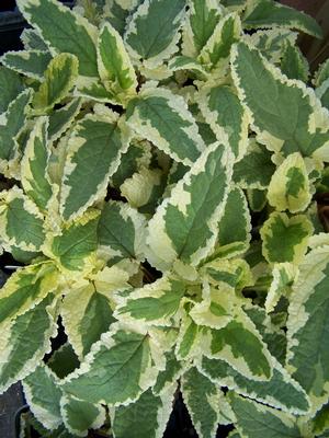 POND & WETLAND PLANTSScrophularia auriculata 'Variegata' - Coarse green leaves with pinkish-red leaf stems are boldly margined in creamy white. Small, fat, rounded tubular flowers squat flowers are curiously red to red-brown and attract hummingbirds. Variegated Water Figwort is a virtual evergreen in warmer climes. Easy. Site in full sun to part shade in constantly moist soil, sandy loam is excellent. Farther south plant it in more shade. This herbaceous perennial will be very content stream side or at the edge of a pond. Cut Scrophularia auriculata 'Variegata' back if the foliage becomes worn by mid season and it will recover quickly with new, dense and bushy foliage. We have seen this plant listed as being hardy to USDA zone 3 - don't believe it! Cutting grown.