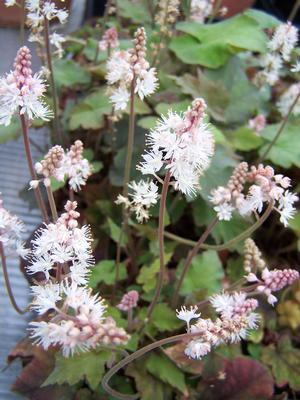SHADE PERENNIALSTiarella cordifolia v. collina (syn. T. wherryi) - Wherry’s Foamflower forms a non-running clump. This varietal form, also known as Heartleaf Foamflower, forms olive-green leaves loosely resembling small, matte-finish maple leaves covered in fine hairs with maroon coloration following the major leaf veins. Lovely spikes of white flowers with a pink flush may stretch as tall as 12 inches occur en masse in spring, April to May. This terrific, potentially evergreen woodlander picks up dark red tones when the temperatures cool. In sheltered siting from harsh winter winds it will remain evergreen. Wherry's Foamflower prefers duff around the crowns as the roots reach for richer, more substantial substrata. Pot grown Division.