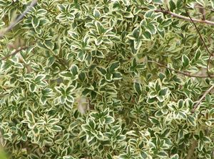 BROADLEAF EVERGREEN SHRUBSBuxus sempervirens ‘Elegantissima’ (ex: Hinkley) – A beautiful dwarf variegated mounding shrub eventually achieving between 5 to 6 feet. 'Elgantissima' is very slow growing. John Marchacos believes that 'Elegantissima' is sometimes confused with 'Variegata Nana' which for him is apparently even slower growing and possibly at maturity achieves a shorter height. Use only larger pot-grown plants of Buxus sempervirens at the northern end of the zone range for successful establishment. English Boxwood is best sited protected from prevailing winter winds. The origins of this form are unknown… but the species originates in So. Europe, W. Asia, No. Africa. Cutting grown. Fertile draining soil on the neutral to acid side of the Ph spectrum in part sun, afternoon shade. Organic mulches are very beneficial. Cutting grown.