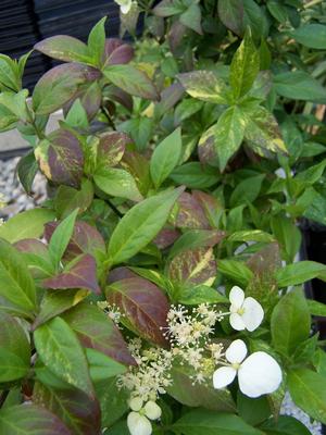 DECIDUOUS SHRUBSHydrangea luteovenosa 'Aureo-variegata' (syn. Hydrangea scandens 'Fragrant Splash'?) – This interesting and seldom encountered hydrangea apparently originally came via the capable hands of the astute Dan Hinkley. It is genuinely rare in this country. The Variegated Sweet Hydrangea is cloaked in small leaves which sport very noticeable irregular golden splashes that fade to cream-white with maturity. When temperatures cool and purple flush envelops the foliage with lighter pink-purple in the variegated zones – very handsome. Also, there can be a bronze-purple self protecting flush that develops in sun which underscores the variegation in a most beautiful way. An especially lovely bonus is that its early white spring lace cap flowers are actually fragrant. Nice! For gardeners towards the northern end of its range spring planting is advised. Established cutting grown in pots.