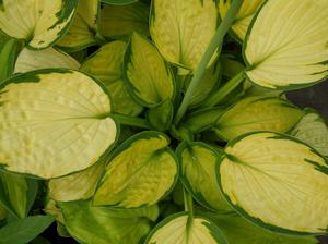 HOSTAHosta 'Rainforest Sunrise' – Striking recent intro with nearly white flowers atop 18 to 24-inch scapes hover in mid-summer over a mound of cupped leaves of good substance – bright gold with bordered with a contrasting quarter-inch dark green margin. 'Rainforest Sunrise' grows about 10 inches tall by 25 inches wide, a striking sport of one of our favorite golden-leaved hostas, 'Maui Buttercups'.