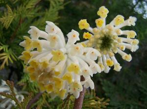DECIDUOUS SHRUBSEdgeworthia chrysantha – Only 1 available. Oriental Paper Plant is a fascinating daphne relative. A customer of ours who is a daphne freak (I mean that in a completely complementary vernacular usage) has this plant growing happily in a sheltered spot in Montville, Connecticut. She lives in USDA zone 6; the shrub is probably in a 7a micro-climate and is thriving. Its large fragrant flowers cream-white floret harbor a beautiful bright golden yellow center - a fresh, bright tint. Quick growing Mitsumata, another common moniker, flowers early in the season with large, showy, rounded downward-facing clusters of flowers set like rounded Chinese lanterns on the dark brown stems. Medium matte-finish green tongues of leaves erupt soon after cloaking the shrub. Edgeworthia chrysantha looks clean and green all through the growing season with the leaves possibly achieving some yellow tones in the fall. If this occurs think of it as a bonus. The form of the shrub is rather like a round-crowned dome. Very attractive. Next year's flowers are held in silvery buds which are handsomely set on the smooth dark brown stems in winter. This is a neat shrub tending to be easier in garden culture than many of the daphnes. Edgeworthia chrysantha should be planted more. Check it out! Full sun in fertile, draining soil. Cutting grown.