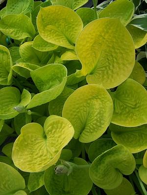 HOSTAHosta 'Maui Buttercups' - Each bright yellow leaf – A glowing, eye-catching tint, 'Maui Buttercups' is cupped, seer-suckered, of heavy texture and quite rounded each leaf measuring 6 inches long by 5 inches wide. Forming a dense mound about 10 inches tall, the near-white flowers of 'Maui Buttercups' completes the portrait in July. We are enamored with this hosta and wonder why it isn't better known?