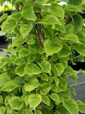 VINESHydrangea anomola ssp. petiolaris 'Miranda' – Variegated form of Climbing Hydrangea with the centers of all dark green leaves generously edged in bright yellow, a beautiful contrast. Plant 'Miranda' in fertile soil and set her in more sun than not. If so, you will achieve better flowering with typical domed white lace caps, the central island of fertile parts beautifully surrounded by the sterile florets which may be attractiors for the pollinating insects. Just beautiful in all respects. Because of the lesser amounts of chlorophyll in the leaves this may be slower to settle in and in northern climes may want a year or two of winter protection until it grabs hold. Worth the effort. We layer these and it takes a few years to grow a substantial plant. For gardeners towards the northern end of its range spring planting is strongly advised.