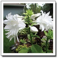 HOSTAHosta plantaginea 'Aphrodite' - Large. Gorgeous, large and intensely fragrant pure white double flowers trumpet upon 30-inch scapes on this version of the August Lily. When, you ask? Well, August of course! Each flared trumpet flower displays a double perianth; flowers can measure 5 inches in length. Shiny green leaves measure 11 inches long by 7 inches wide. Hosta plantaginea is a plant that requires more sun than most hostas to achieve its flowering goal. These are burgeoning in 2 Quart Pots, a bargain filled with the eyes of many plants... divide and conquer the empty spaces in your gardens!