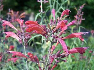 SUN PERENNIALSAgastache rupestris - Masses of pretty orange to burnished orange tubular flowers backed with a touch of lavender-purple blossom successively for a string of weeks end in summer on an upright mounding plant that may reach as tall as four feet. The matte-finished foliage is gray-green and smells strongly of anise when one brushes up against it. It's olfactoriously delicious... yeah, yeah - I know it's a completely made-up word - bad, BAD English. BAD Wayne! Sunset Hyssop draws hummingbirds. GOOD plant! Agastache rupestris also goes by the common names of Rock Anise Hyssop, Licorice Plant, Thread-leaf Giant Hyssop and Licorice Mint. Enough already... you get the idea. Sunset Hyssop's originates in the mountains of Arizona. Full blazing sun in very lean, draining soil. Sandy, scrabbled soil is best. A little dolomitic limestone in the planting hole wouldn't hurt. May be a relatively short-lived perennial but will self-sow if conditions fit enough of the aggregate components of its requirements. Established plants are seed grown.