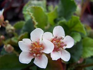 SHADE PERENNIALSBergenia pacumbis x ciliata 'Susan Riley' – a gorgeous, bold hybrid with frilly symmetrical pie-crusted edges upon the large, hirsute and rounded paddle leaves. As the plant becomes adapted to its planting site the leaves can grow to the size of small dinner plates. In more sun they develop a pink-red infusion. Stunning! Then the glossy medium green with pubescence on both sides of the foliage, they will contrast beautifully set with more refined and delicate plants. At the end of the growing season leaves often pick up a beautiful red infusion just in time for the gardens' autumn festivities. Very attractive clustered pink flowers atop thick stalks emerge in spring prior to the emergence of the amazing leaves. An even added bonus is that the alluring leaves can remain semi-evergreen at the warmer end of the growing range. This extraordinary, well-behaved Bergenia is clumping. A colony is a memorable sight. Fertile, friable soil in part sun – probably best in afternoon open shade. Big pots worth the expense. Some of the common names associated with any among the species or hybrids in the genus, Bergenia are... oh, God help me: Elephant-eared Saxifrage, Pig Squeak, Heartleaf Bergenia, Siberian Tea, Elephant Ears among, no doubt and unfortunately, others. Established pot grown division.