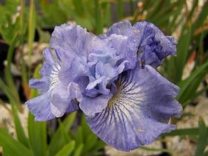 GRASSES & GRASS-LIKE PLANTSIris sibirica 'Joyous Ruffles' - A lovely light blue Siberian Iris. Luminous pale blue heavily ruffled falls. Darker veining demarcates the pale blue becoming increasingly pronounced as they draw closer to the bases of the falls. Falls support highly ruffled styles and standards in the same pastel blue for a flower projecting a feminine aura. Lots of flowers on this Middle Late beauty. Another most worthy Marty Shafer / Jan Sacks introduction. And talk about a complex gene pool: Jolly Young Man x ((S96-2-1A: (Riverdance x ((Young Lady x Harbor Mist) x (Kenabee x Alter Ego))) x (sib to Turn A Phrase x In Full Sail)) x (S96-2-1A x Mister Peacock))... I'm deliriously and joyously slap-happy! Fully to mostly sunny siting in fertile, moisture retaining soil. Established, pot grown from division.