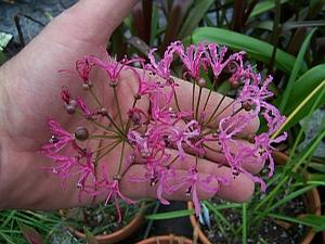 First come the stalks carrying the pretty, soft pink flowers; then come the strap-shaped leaves on this, one of the many fantastic South African Nerine species. Flowering stalks are bronze-green holding flame-shaped buds that are reddish-purple. Flower petals are crinkled a bit like crepe paper. They remind us of Witchhazel flowers due to the crinkling. Leaves are narrow belts. Incidentally, hysteranthous is the characteristic name applied to any bulbous plant in which flowers arrive first followed by its foliage. Ours flower reliably during November after having brought them into a cool greenhouse after having spent the spring and summer outdoors. This species which some are now placing under N. undulata does not readily increase from bulbils. These will likely be from seed-grown progeny. Coming from the Eastern Cape Province Nerine alta is found on steep slopes in partially shaded conditions. Good drainage is important in summer with drier conditions in winter advised. The addition of silica when planting may be helpful. Otherwise, this is an easy-going plant. Established pot grown bulb from seed.