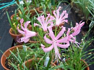 BULBSNerine angustifolia (ex: Ellen Hornig) – The pretty array of pink flowers with lightly pie-crusted petals set atop stalks that can stretch to as high as 3 feet. Green strap-shaped leaves grow to be approximately 12 inches tall. Colonies inhabit grassland marshes in montane areas of Lesotho, Swaziland and South Africa. A large colony can be breathtaking in flower. Autumn blooming for us these enjoy summer moisture in a well-draining mix in terra cotta with winter dry during dormancy. In a greenhouse situation the foliage of Nerine angustifolia may remain evergreen. As with all the Nerines we offer summer moisture is a good thing within reason as long as bulbs are planted in a well-draining mix. Drier winter conidtion is advised. The addition of silica when planting may be helpful. Established pot grown bulb from offset or seed.