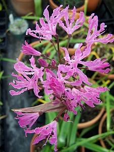 Later to rise that the form form from Ecca Pass. Crinkly soft pink petals on this late summer blooming Nerine. Anomolous or not this form has flowered for us in a cool greenhouse in January, February into March, just lovely in winter. The open, domed flower array setting atop stalks from 10 to 12 inches tall. These produce from bulbils fairly quickly. As with all the Nerines we offer summer moisture is a good thing within reason as long as bulbs are planted in a well-draining mix. Drier winter conidtion is advised. The addition of silica when planting may be helpful. Winter dry is essential. We have found all of our Nerine fairly easy-going. Established pot grown bulb from offset.