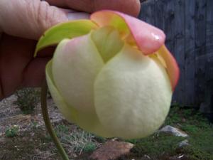 These are the fascinating Pitcher Plants. All are from eastern North America, most from Southeastern U.S. One species occurs in the north all the way up into Newfoundland in peat bogs, Sarracenia purpurea with USDA zone 4 hardiness... perhaps some populations hardy into zone 3. The spring and summer flowers which last for many weeks are as beautiful as they are fascinating. All species have evolved pitchers with passive pitfall traps… the insects enter but can’t back up due to downward facing hairs which disallow retreat. They are structurally curious and in their own unique way very beautiful. All require constantly moist to wet feet, boggy conditions suit them well or can be easily pot grown in 50% coarse sand to 50% peat mix. In a natural setting they can tolerate vernal flooding but for most of the year their crowns must be above the water line or they will rot… yes, I know: it’s hard to believe! Most of the literature tells you not to feed them and it is true that any chemical fertilizer should be avoided as these plants have little tolerance to salts. But you can use quarter strength fish emulsion on occasion and I mean only on occasion, not at every watering, and only during active growth. Potted plants must be re-potted every 2 years with a fresh mix of peat and coarse sand or they languish. They are easy to transplant and respond well to good treatment. Most prefer sun although I have found that S. purpurea seems particularly happy during the summer under the shade cloth in my greenhouse. That was a bit of a surprise as I’ve seen them growing in the bright open sunny conditions in the fantastic peat bogs of Nova Scotia. Generally I would say they need be planted in full sun in the north to to partly shaded exposure in the south. They make fascinating potted plants. All of the following are offered by division.
