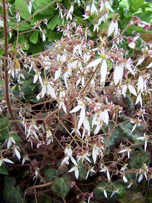 SHADE PERENNIALSSaxifraga stolonifera 'Maroon Beauty' (ex: Ruth and Whitney Gorham) - Creeping Rockfoil is just plain beautiful. If you are not familiar with Saxifraga stolonifera this may be a good time... Rounded leaves exhibit red to red-purple tissue between bright green veins. The nicely demarcated color contrast creates a pleasing, pretty and artistic patterning. Furthermore, the very hirsute rounded leaves set on red petioles augmenting the rich complexity. Leaves exhibit also an attractive juicy red flush on the undersides. This very worthwhile shade lover requires fertile, moisture retaining soil. It spreads from wiry stolons forming a most handsome ground cover that never seems to squelch surrounding plants... of course, you wouldn't want to pair it with that stratospherically expensive miniature stupid-slow growing whatsit-thing-a-ma-bob that would wither at the sight of a mere weed glaring at it from a distance of three feet away! The mat of gorgeous leaves grows only 2 to 4 inches tall. But with large compatriots it's well-behaved and beautiful... Hosta, Polygonatum, Fern, Ginger, Helleborus, Rodgersia, Astilboides - you get the picture. Pretty little white flowers open on branched stems on 6-inch possibly up to perhaps 8 inches in late spring occurring en masse like a snow squall. Hardiness estimates are all over the board. Ours had been growing for years in USDA zone 5b in one of the beautiful gardens of Ruth and Whitney Gorham. Established pot grown from harvested stolons.