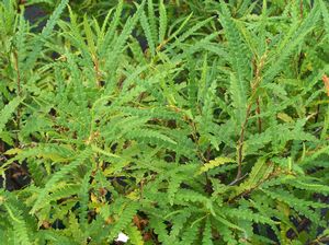 DECIDUOUS SHRUBSCompotonia peregrina – 2 remaining. Sweetfern is one tough customer. It will adapt itself to dry hardcore scrabble in full blazing sun. An interesting native, it sports stems with coarsely notched and scalloped alternating pinnate foliage loosely resembling fern fronds. Sweet Fern spreads rapidly fixing nitrogen in the soil as it expands its domain. It is a colonizing, ground covering shrub. Comptonia will even tolerate salty conditions at the shore. Its delightful fragrance (hence the common moniker Sweetfern) was not lost on early settlers who stuffed mattresses with its dried and pleasantly aromatic plumes. This wily ground cover generally grows about 2’ to 2.5’ tall but in better soil conditions could rise as high as 4’. I have run across colonies, dwarfed by desperate condition, growing only 12” to 14” high. Cutting grown.