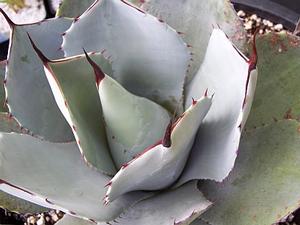 ARID LAND PLANTSAgave parryi ssp. truncata – This is considered to be one of the most beautiful among the amazing Agave clan. A red-brown serrated edge decorates each light powder blue-gray tough, fibrous, broad blade ending in a sharp glossy red-brown spike. The deep, warm color of the spines contrast in striking beauty to the matte finish cool blue of the flesh. All agaves are sculptural and add strong architectural presence and beautiful color in any application. Parry's Hardy Century Plant will grace any succulent collection in a container or as a year round living sculpture in the full sun garden. Well-drained fertile soil amended with coarse grit for added drainage. Keep drier in winter. For gardeners towards the northern end of its range spring planting is advised. Established pot grown offsets.