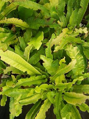 FERNSPhyllitis scolopendrium (syn. Asplenium scolopendrium) – Hart's Tongue Fern with its leathery bright green, irregular glossy fronds appears to be almost other wordly. Each virtually evergreen frond stretches 8 to 12 inches long by 2 to 3 inches wide. Site in part to dappled sun in fertile, moisture retaining soil. Phyllitis scolopendrium will benefit from the addition of dolomitic limestone to the planting hole. The species is found in Ireland, Britain to North Africa, Eurasia, east to Japan... I may have missed some locales! Spring planting may be the wiser tact for gardeners towards the northern end of its range. Please scroll down to the Genus Overview for more information about ferns. Established pot grown fern from division.