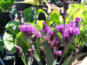 SUN PERENNIALSVernonia missurica - Dark purple flowers en masse top erect stems that may grow to 4 feet. Missouri Ironweed is one of the shorter growers among this under-appreciated clan in Asteraceae. Just perfect with late season Rudbeckia, Aclepias, Helianthus as well as Eupatorium. Average to fertile, moisture-retentive soil in plenty of sun will satisfy its needs. Middle of the border, meadow, the perennial garden with an emphasis on late season flowering plants. Established potted Ironweed from cutting or division.