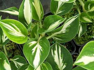 HOSTAHosta 'Americana' - This striking medium-sized sport of 'Loyalist' displays a big white streaked flame as the central color broadly limned with very dark green with a sheen. 'Americana' is a very clean looking cultivar with thick, waxy, broadly ovate leaves, 7 inches long, 5 inches wide. Good slug resistance. Medium lavender tubular flowers occur July-August on scapes 20 inches tall. We have hummingbirds, bees and butterflies visiting our Hosta flowers... please stop cutting off the flowering scapes - aside from robbing the flying creatures from sustenance it is to be blunt: a bizarre affectation! This sport of 'Loyalist' was introduced by Walters Gardens. Established pot grown plant from division.