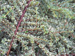 DECIDUOUS SHRUBSCotoneaster horizontalis ‘Variegatus’ – This is the beautiful variegated selection of the Rockspray Cotoneaster. It is a deciduous all-season plant in full sun. Beautiful white-edged green cupped leaves, like a library full of miniature half-opened books, pick up pink tones in autumn. Small pink buds in spring open to tiny pink-tinged white flowers. These cute little flowers develop into berries which turn bright red come autumn. When the foliage drops you are left with these red fruits on a refined herring bone branching pattern. This deciduous ground cover with its amazing array of gently arching branches will grow up to 2’ tall but 5’ to 7’ in diameter. I have also seen this plant used to great effect trained-up against the side of a building. Especially beautiful after light snowfall with delicate embroidery of snow clinging to the fine ribbing of the branches, this is an extraordinary moment in the winter garden. Cutting grown.