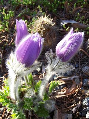 SUN PERENNIALSPulsatilla vulgaris - Big showy Easter egg-purple chalices arise in April over attractive dark green deeply cut, almost ferny leaves. New growth is notably covered with silvery hairs, especially noticeable when the filaments glow incandescent having caught the sunlight like fiber optic filaments. It's simply beautiful and continues to be attractive after flowering. Seed heads turn dark olive green standing above the foliage mound resembling some Clematis seed heads or even sea anemones. The seed heads dance in summer breezes for a very long time. Looking a whole lot like P. vulgaris we suspect that it may just be that... certainly RHS indicates the name Pulsatilla turkestanica "is not found in literature". This plant originated with Seneca Hill Perennials; Ellen's information is usually quite sound but we duly question the validity of this categorization. Pulsatilla vulgaris originates in grasslands and into lightly forested areas in France, England west to the Ukraine. Full blazing sun in well-drained sand-scrabble mix with 20 to 30% good soil... add a little dolomitic limestone, sit back and enjoy. Plant it in too heavy a mix and it will rot. Plant it in a rut and it will rot. If happy it may occasionally self-sow... it does for us. Established pot grown Pasque Flower from division or seed.