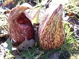 POND & WETLAND PLANTSSymplocarpus foetidus - Early to mid spring shipment only. Get 'em in boggy, swampy, rich mucky ground right away! Huge bold green paddles erupt following the curious hooded mahogany-purple spathe, often clustered in numbers at ground level. The mahogany-purple "parrot beaks" can be mixed with short green lines upon the leathery hoods. The spathes protect the fat spadix where when pollinated the seed will mature. Eastern Skunk Cabbage revels in boggy, swampy conditions where rich bottomland soils accumulate. Indeed, constant moisture to mucky condition is required. Early season sun through deciduous overstory provides perfect light. When leaves populate trees and cast more shade as the arc of the sun rises and beams become more intense the increasing cool shade protects the huge leaves. Naturally occurring in Ontario east to the Atlantic. In the U.S. from Minnesota, Iowa, Illinois, Kentucky, Tennessee and encompassing all states east to the Atlantic Ocean. We have Skunk Cabbage growing wild in many wet areas of our property in open shade to dappled exposure. We love its curious and bold presence in the wild scheme of things. Then again we love bogs and swamps; we think them fascinating habitats, most especially in the early season when mosquitoes haven't awakened. We think it especially fetching with moisture loving ferns and our native Jack-in-the-pulpit, Arisaema triphyllum. Established pot grown division.