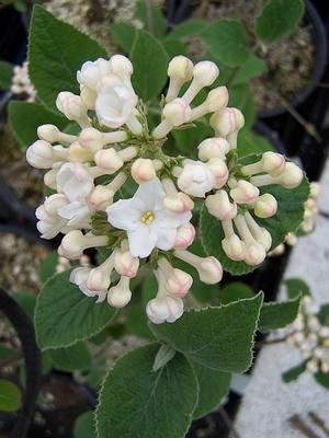 DECIDUOUS SHRUBSViburnum carlesii 'Compactum' - A dwarf form of Korean Spice Viburnum. All the gorgeous early white corymbs with extraordinary perfume on a smaller plant. Flowers are 3 inches across and hemispherical snowballs opening in March to early April from pink-red buds. Maroon autumn color and blackish berries. Though listed as generally growing 3 to 4 feet tall it may shoot up a bit taller in time. Found at Hoogendorn Nurseries, inc. in Newport, R.I. Fertile, draining ground in sunny to mostly sunny exposure. Established potted viburnum, cutting grown.