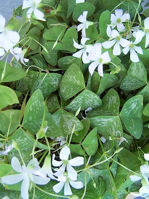 SUN PERENNIALSOxalis regnellii 'Irish Mist' - All green triangular leaves are heavily overlaid and finely stippled in silver-white. There is a line of green following the central vein on each of the three lobes. Wood Sorrel is also commonly called Shamrock... Shamrock, indeed! Clusters of pink to white funnel-shaped flowers on tender stems rise above the leaves and flower for a long time. Good potted windowsill plant but is garden worthy in USDA climate zones 7 to 10, possible 6b in a sheltered situation. We actually accidentally dropped a piece of O. regnellii in the border that runs along the south foundation of our home; it has erupted annually for years now. We are USDA zone 5b though the garden where O. regnellii sprouts is a warmer microclimate to be sure. Adaptable to soil but keep drier during dormancy when potted. Part shade to mostly sunny exposure though. Established potted Shamrock.