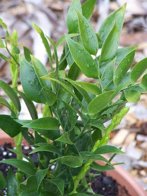 BROADLEAF EVERGREEN SHRUBSDanae racemosa - Full and Bushy. The Poet's Laurel or Alexandrian Laurel is a prized broad leaf evergreen plant where it can be grown outdoors. It can otherwise make a very respectable potted plant in a cool conservatory or greenhouse. Heavily textured lustrous green leaves adorn arching green stems. The leaves look rather like bay laurel foliage. Greenish yellow flowers are not significant but showy fruits, orange to red-orange grape-sized globes, stud the plant in fall. It's very slow but very easy to grow and tolerant of some abuse... that is, if you abuse your plants. Site in part to fully open shade, deeper shade is possible in more southerly locales. Plant in any decent garden soil. Poet's Laurel is drought tolerant once established. Poet's Laurel is tolerant of urban pollution. Established, pot grown via division or seed - more likely division.