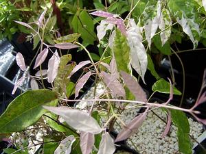 VINESBignonia capreolata 'Variegata' - New emergent leaves and stems are showy pink and some pure white maturing into dark green simple leaves streaked in silvery milk. Older leaves are mostly green with white flecks and splashes but sometimes a bit of pink remains. The main flush of large, showy flame flowers in clusters emerge in spring with a secondary flowering again late season. When in flower this evergreen vine draws butterflies and hummingbirds to its large cymes of funnel-shaped flowers. The pink returns to the leaves in fluorescent fashion come autumn as the green tissue flushes purple. And the foliage turns rich, dark and deep maroon in winter - it's really quite beautiful. Stems are wiry. This is the first and only variegated form of Fragrant Crossvine of which we are aware. Who stumbled upon this rare form and where... well, we don't know?! However, the nativity of Bignonia capreolata is southern Ontario and the eastern U.S. As with many vines this can be strong grower. It can be controlled by annual pruning... Bignonia capreolata 'Variegata' blooms on old wood so if you are going to prune it be sure to do so right after its flowering period is completed. This was an amazing gift from Jonathan Lehrer, our Planta Claus. Yes, Virginia, there is a Santa. Full sun to part shade. Plant in average to fertile, moist soil. Established vine from cutting.