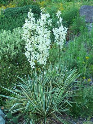 ARID LAND PLANTSYucca filamentosa 'Bright Edge' - A very nice, mid-sized Yucca with foliage standing about 18 inches tall. All blue-green swords are broadly-edged in warm yellow which ages to cream. Branched flower spikes rise to about 60 inches carrying large open-faced five-petaled white flowers up to four inches in diameter. The flowering event is showy and eye catching. Each flower upon opening exhibits a soft granny smith apple green infusion in the flower center melding generally into the petal centers with the overall flower pure white. Flowers age to creamy ivory sometimes barely holding onto a green tint. Ours, a permanent fixture in our rock / cacti garden, has slowly increased its numbers in a tightly clumping fashion over the course of many years and has never demanded much space. This version of Y. filamentosa sports fewer filaments than the species, is infinitely more demure, slower to size up and is charming. Nice as a small specimen, accent in the full sun herbaceous garden, terrific in a sunny rock garden, a fantastic companion to Opuntia and Daphne alike... seemingly endless uses as long as it is placed in full sun exposure planted in well-drained conditions. A little lime in the planting hole would be appreciated. Established Yucca, pot-grown from division.