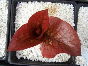 SHADE PERENNIALSCardiocrinum cordatum v. glehni - Newest leaves are simple like rhubarb; they emerge with notable red-purple veining. These expand into broad, flat glossy paddles, more bold than not. The leaves will return annually with an increasing number added among their ranks in the ensuing years until the inflorescence arises... I mean the leaves are still there but in a flowering year all eyes are on the expanding buds! Large lily look-a-like flowers in a creamy shade infused with green alternate on a stem that may attain a height of six feet. The interior base of each flower is underscored in red-purple. Flowers are fragrant. After flowering a single large, mature bulb will break down into smaller pieces, each with the potential of sizing up into another amazing display displaying more individuals in a few year's time than the first go-round. The span of time between a "bulby" morsel and the amazing flowering event is about 4 years. Yes, patience required... but imagine the pay off if you can find the laudable quality within yourself! Just gulp! And imagine a stand of these beauties - yikes! Do it! You can claim that you embody the patience of a saint with your head held pretentiously high sneaking glimpses of your adoring adherents. But please be self-aware enough to know that your loved ones and even some of those who don't love you quite so much have you pegged. Just sayin'. Though we have this fine bulbous plant hardy in zone 6 if you live farther north with assured deep snow cover in winter you can likely grow this plant right into zone 3. Also, it should be mentioned, this fine plant might be susceptible to lily leaf beetle where it is prevalent... I don't know for certain but am suspicious. Fertile, draining soil in open, dappled or late morning / afternoon shade. Potted Cardiocrinum.