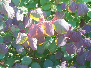 DECIDUOUS SHRUBSDisanthus cercidifolius – Disanthus is a most handsome and another aristocratic member of the Hamamelidaceae. Michael Dirr calls it “magnificent”, an observation to which I heartily agree. Speaking of “heartily”, the moniker, cercidifolius, refers to the most attractive heart-shaped blue-green leaves. They change in autumn to a rich, deep red-purple shade sometimes infused with orange from late season well into the fall before finally dropping. It will form a multi-stemmed broad-growing shrub composed of thin gray-brown branches. Dark purple-red paired flowers blossom in the leaf axils in October, not especially showy; in fact, you are likely to miss them altogether unless you make a point of peering into the shrub looking for them! Nonetheless the flowers are interesting. Plant Disanthus cercidifolius in moist fertile soil with much organic matter in open to dappled shade. We sheltered ours for three years after the initial planting but our specimen is perfectly content now that it has attained some size without further protection. Though I have seen this shrub listed as hardy to USDA zone 6 it has behaved well for us with no tip die-back in harsh winters. Our shrub sets resplendently in a location modestly sheltered from winter winds. But please consider whether or not this may be a wise choice for your area if to be planted in autumn. Established potted shrub, cutting grown.