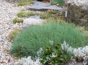 ARID LAND PLANTSEphedra minima – The new 4” to 6” gray-green segmented filaments which substitute for actual leaves rise vertically and gradually find decumbency by their second year creating a wonderful wild-haired grayish evergreen tousle. With two you get fantastic red chickpea-like pods that remain for months studded among the gray-green mass. This small Mormon Tea will settle happily in scree or scrabble in full sun. It would make a beautiful evergreen trough or pot plant as well. A xeric plant, it requires no extra water during the growing season. Ours are planted among boulders and stone in the scrabble of our cacti and succulent garden where they have gradually increased their girth like curious evergreen shag carpets. This is a very cool primitive plant providing an unusual texture especially when used as counterpoint to more architectonic plants. Pot grown division.