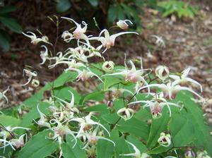 SHADE PERENNIALSEpimedium x 'Domino' - This exceptional Darrell Probst hybrid produces an extraordinary number of flowers - greater than 100 upon a well-established clump with stems rising to 2-foot. Each little "spider" is white-spurred with a purple-maroon cup at its heart. Green leaves are spiny and mottled with bronze- purple to amber-maroon. Parentage is apparently unknown. This modest increaser is a Barrenwort of great merit. Established pot grown plant from division.