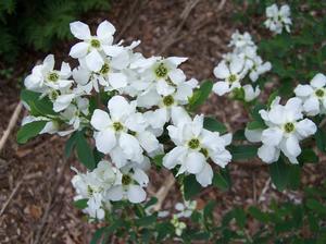 DECIDUOUS SHRUBSExochorda korolkowii - The Turkestan Pearlbush produces masses of lovely pure white flowers from late spring racemes on a shrub with a rounded form. The tongues of blue-green leaves with somewhat undulating edges remain clean and attractive in summer. Autumn foliage may turn a respectable yellow. It's tough, easy, exceptionally handsome and downright beautiful when in pristine flower. It is also oddly under-utilized in our gardens. C'mon, people! Aren't you sick to death of petunias and impatiens yet???! Glad I got that out of my system. So, guess where the Turkestan Pearlbush originates? Though Exochorda korolkowii will probably grow in the deep south it may be the unfortunate recipient of leaf scorch which will mar its summer beauty. And we are honestly impressed with this handsome mounding bluish green shrub. When in flower it is pure beauty. Site in full sun planted in fertile draining soil. Cutting grown. Established.