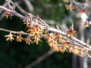 This bit of history from Witch Hazels by Chris Lane: "Selected and named by J. C. McDaniel of Urbana, Illinois, because it is one of the first clones of Hamamelis vernalis to come into flower. The original plant was brought from the Missouri Ozarks by Dr. James W. Gerdemann, professor of plant pathology at the University of Illinois College of Agriculture. This plant will flower around Christmas and is very fragrant with reddish petals. First grown and introduced by Hoogendorn Nurseries, Newport, Rhode Island, about 1978."