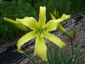 DAYLILY (HEMEROCALLIS)Hemerocallis 'Easy Ned' - A very nice spider form with a yellow/chartreuse-yellow self and a cool green throat. There is more green in this large flower than found in 'Spider Miracle'. The petals are also more recurved. Easy going, Ned takes its time sauntering along to get to its flowering cycle which begins in late summer!