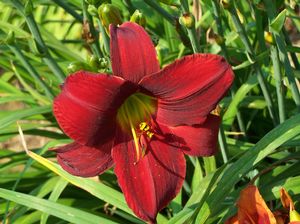 DAYLILY (HEMEROCALLIS)Hemerocallis 'Ruby Throat' - This is a beautiful deep velvet red self with a glowing lime heart. Though usually listed as growing 21 inches tall ours has always exceeded that threshold and is always 24 inches high at least. 'Ruby Throat' is a shade darker red than 'Red Volunteer'.